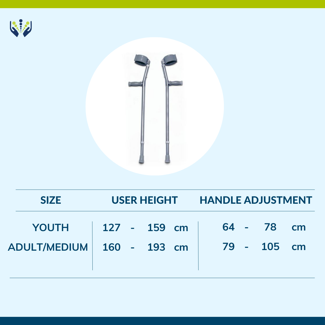The Forearm Crutches Ergo are height-adjustable walking crutches with a cuff around the forearm. They are available in 2 sizes: for adult or youth.  These elbow crutches provide the necessary support and adaptability you need to stand or walk.
