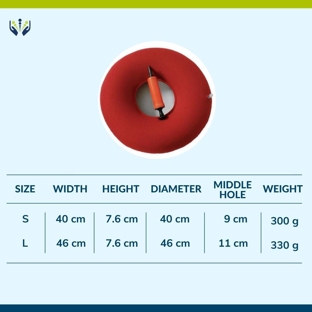 The Inflatable Cushion Ring from MedPro is a rubber air cushion designed to improve support and comfort when sitting down in any sort of seat for a longer period of time. The medical donut cushion provides effective pain relief on the pelvic, anal and perineum area, as it allows the sit bones to take the weight, without putting pressure on the tailbone and back.