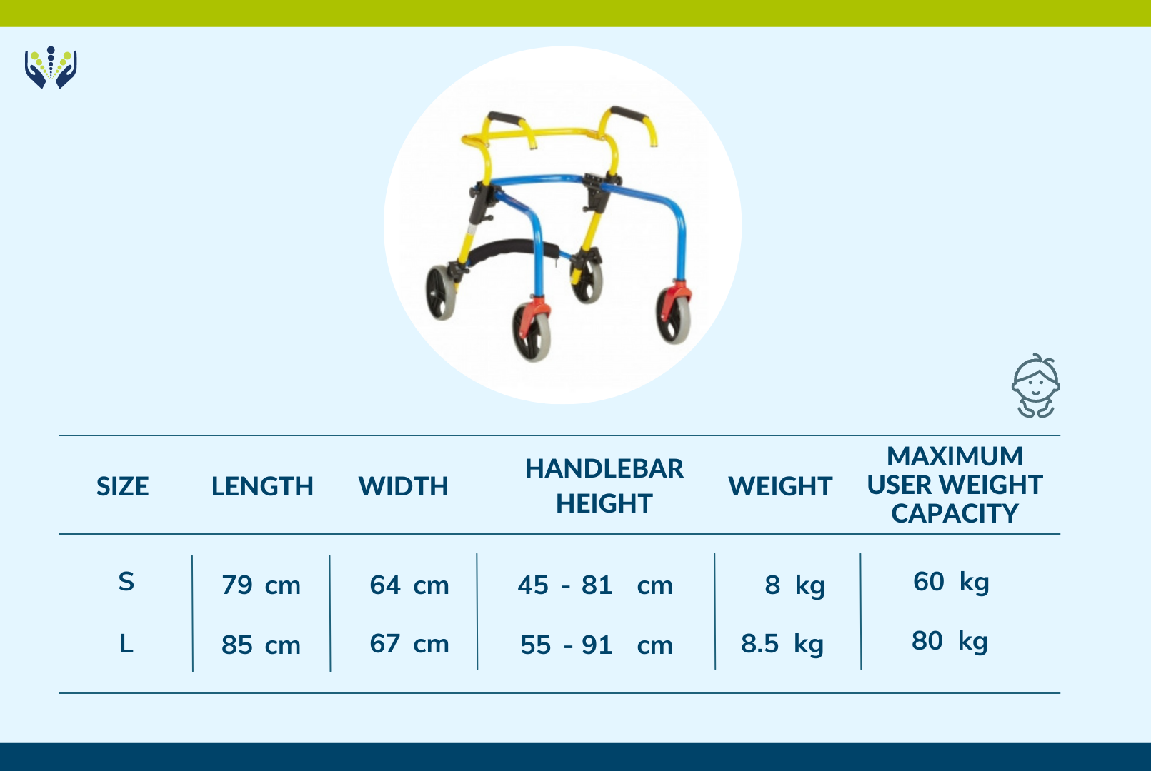 The Pluto Reverse walker for child by Rebotec is available in two models: small and large. Please find the specifications for each model.